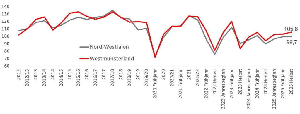 Die konjunkturelle Entwicklung kommt nicht in Schwung. Nur schwache Lichtblicke deuten sich an. Das Konjunkturbarometer Westmünsterland bessert sich nur leicht vom Stand von 103 im Frühjahr auf nunmehr 106 Punkte im Herbst 2025, liegt aber über dem Niveau des gesamten IHK-Bezirks (99,7).
