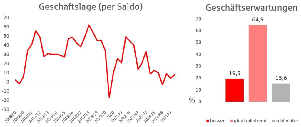 Mit konjunkturellen Impulsen aus dem Auslandsgeschäft ist kaum zu rechnen. Das außenwirtschaftliche Umfeld, darunter vor allem die US-Zollpolitik, dämpft die Exporterwartungen. Im Urteil der Unternehmen könnte es auf eine Seitwärtsbewegung hinauslaufen.