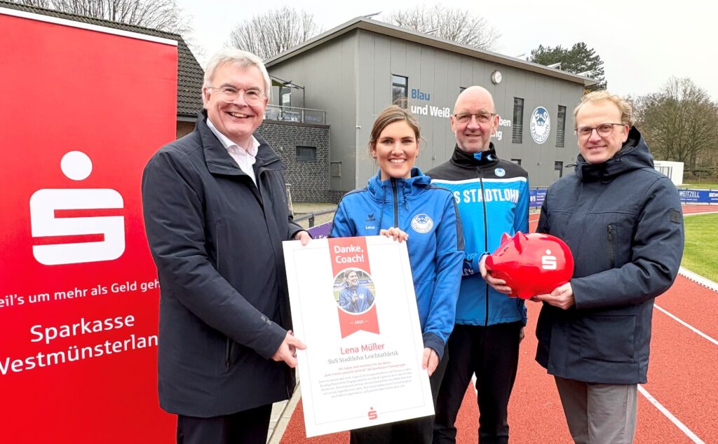 Danke, Coach! – Lena Müller wurde bei der bundesweiten Sparkassen-Aktion „Eure Trainer gesucht (m/w/d)“ ausgezeichnet. Jürgen Büngeler, stv. Vorstandsvorsitzender Sparkasse Westmünsterland (links) und Frank Poppenborg (rechts, Regionalleiter Stadtlohn) sowie Wilfried Steinhage, 1. Vorsitzender SuS Stadtlohn gratulieren.