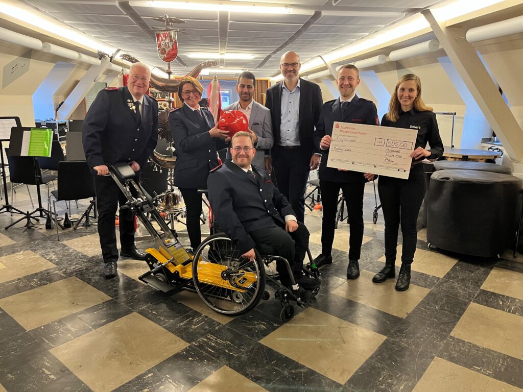 „Ein aktives Vereinsleben trägt wesentlich zur Stärkung des Gemeinschaftsgedankens bei“, betont Heiko Hüntemann, stellvertretender Vorstandsvorsitzender der Sparkassenstiftung und Vorstandsmitglied der Sparkasse Westmünsterland. „Alle sollen die Möglichkeit hierzu haben“, ergänzt Arkin Eryilmaz, Regionalleiter Rosendahl. Auch Anja und Willy Steiner, Inhaber des Edeka-Marktes in Osterwick und weiterer Edeka Märkte, haben den Förderverein unterstützt. Sie forderten ihre Kundinnen und Kunden dazu auf, ihre Pfandbons zugunsten des Projektes zu spenden und sammelten so 500 Euro. „Die Spenden sind für uns eine große Hilfe. Gleichzeitig setzen sie aber auch ein wichtiges Zeichen für mehr Inklusion“, so Benedikt Sicking, Vorsitzender des Fördervereins des Musikzuges der Freiwilligen Feuerwehr Rosendahl e.V. Und: Die Treppenraupe soll auch anderen Personen mit Mobilitätseinschränkungen zur Verfügung stehen – etwa bei Veranstaltungen.