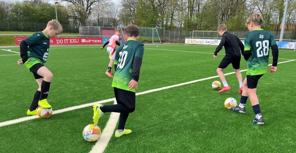 Neben Übungen zum Passen und Schießen und dem Fußballspielen selbst standen auch Kräftigung im Kinderalter, Athletiktraining und Beweglichkeitstraining an der Tagesordnung. Ein echtes Highlight erwartete die Fußballerinnen und Fußballer nach der gemeinsamen Mittagspause: In verschiedenen Turnierformaten wie Champions League oder Europa League konnten die Kicker ihr Können zeigen.